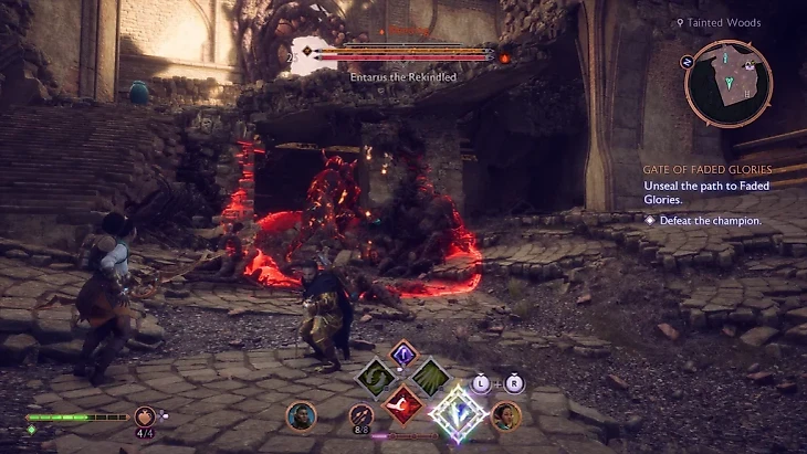 В нашей тактике ключевую роль играл Даврин, принимавший на себя основной урон и регулярно применявший способность «Боевой клич». Это давало возможность восстановиться и вступить в бой, пока другой соратник наносил урон при необходимости. Особое внимание уделяйте атаке натиском Энтаруса. Перед рывком он начинает светиться красным, а затем стремительно бросается на вас. Хотя уклониться несложно, одновременно он выпускает снаряды, способные быстро наложить опасные эффекты состояния.