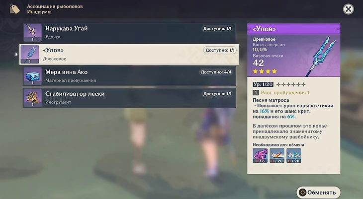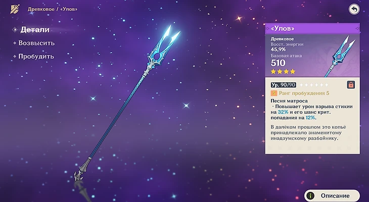 Улов в Genshin Impact – бесплатное четырехзвездочное копье, которое можно получить за фарм рыбы. Одно из сильнейших среди бюджетных благодаря полезности и универсальности. Если вы не фанатичный хейтер копейщиков, задуматься о приобретении этого оружия не поздно на любом ранге приключений.