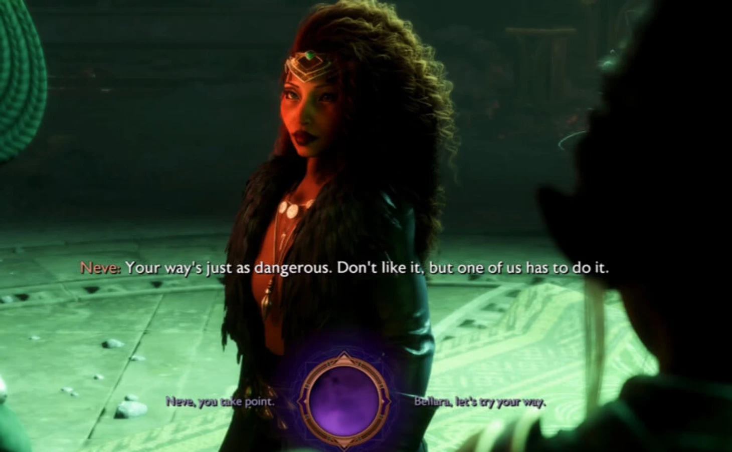 Еще одно решение, которое заблокирует спутника до конца игры. В этом случае лучше оставить Нэв, ведь электрический урон и способности Беллары еще пригодятся в будущем. Если вы выберете Нэв, ее место займет Луканис, и вы тоже не сможете его использовать. В обратном случае вы не сможете взять Тааш, ведь этот персонаж заменит Беллару на работе.