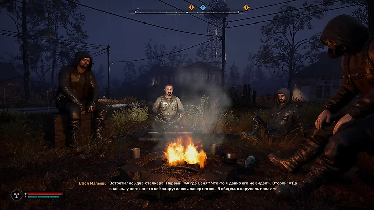 Музыка на фоне приятная, постсоветский дух очаровывает, а NPC временами веселят. К примеру, сидят у костра и травят анекдоты. «Папа-кровосос говорит сыну: «Запомни, никогда не веди дела с полтергейстами. Они всегда кидают». Как же глупо и в то же время мило!