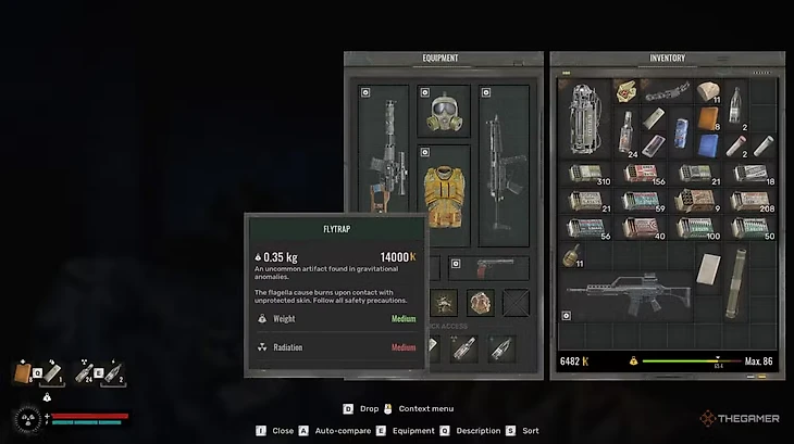 Перед вами экипированное оружие, броня и артефакты, а остальные предметы можно увидеть в области справа. Если вы откроете инвентарь, проверив чужое тело или рюкзак, предметы там будут отображаться слева. Под вашими предметами справа вы можете увидеть полосу максимального веса.
