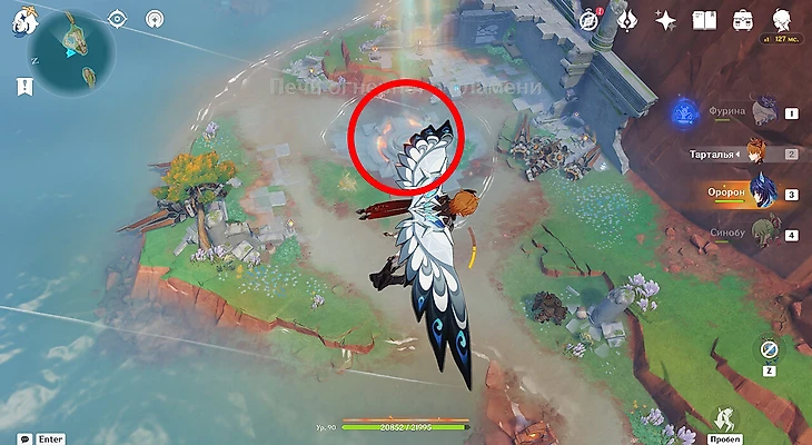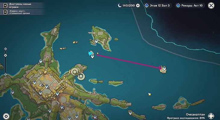 Выполните задание «Засыпанный пеплом город» – цепочку этих заданий можно начать у заблокированной статуи Архонта в Очканатлане. Во время прохождения откроется телепорт на небольшом острове в небе. Вернитесь в это место, а затем долетите до острова на Кукузавре.