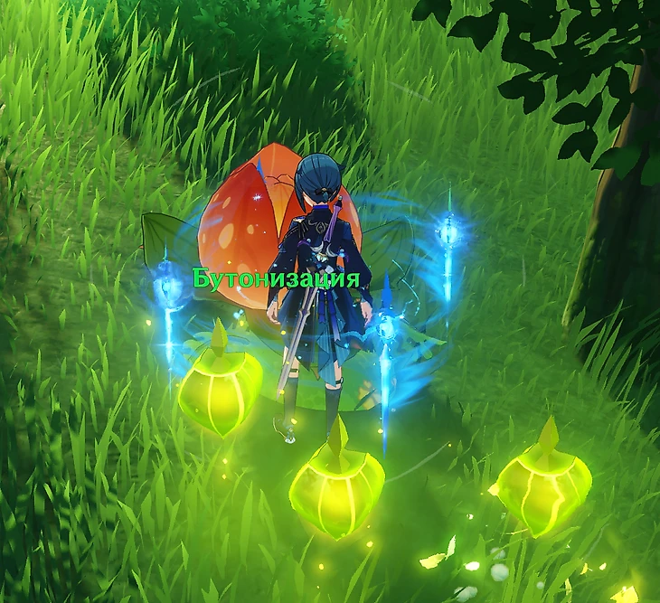 Сочетание Дендро + Гидро активирует реакцию Бутонизации. В результате на поле боя появляется Дендро ядро, с которым можно взаимодействовать.