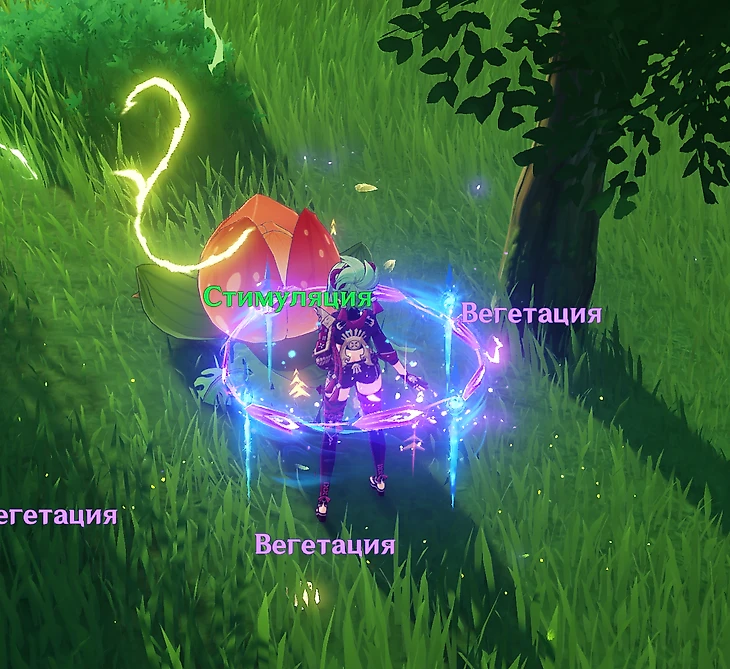 Если на это ядро воздействует Электро, оно превращается в Ползучий Снаряд – самонаводящийся выстрел, наносящий увеличенный Дендро урон. Это и есть реакция Вегетации.