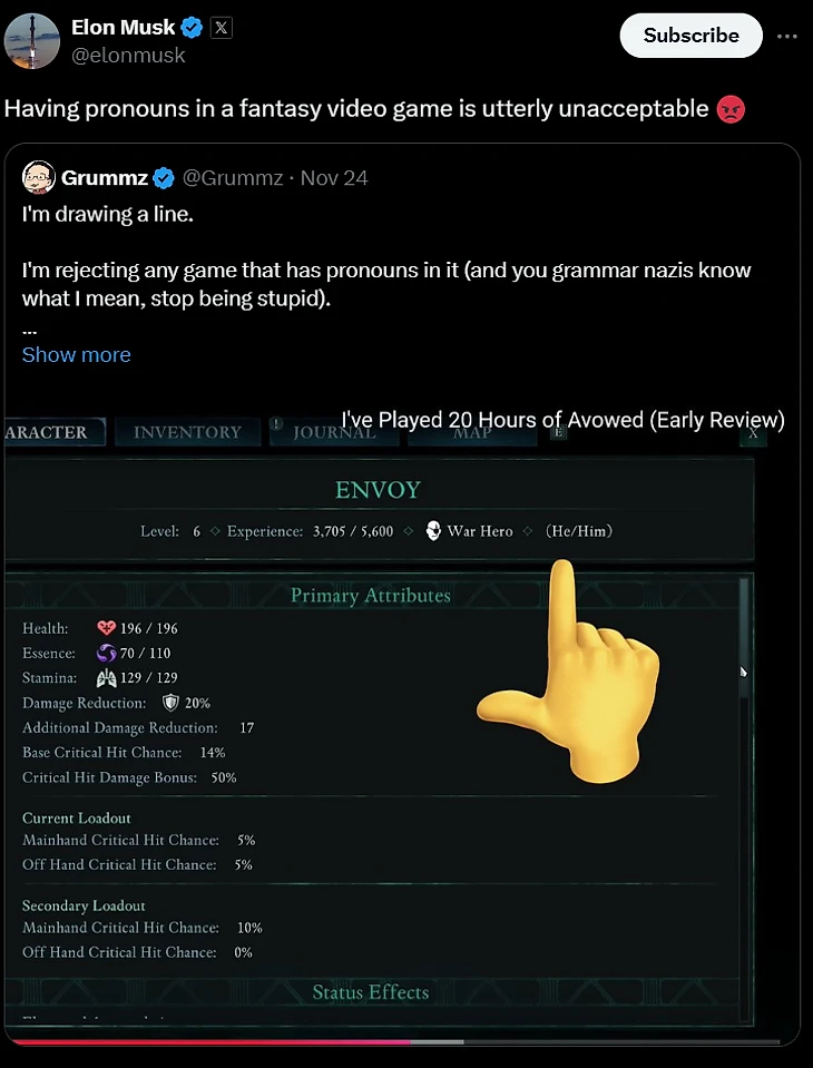 В конце ноября вокруг Avowed развернулась настоящая драма с участием Илона Маска. Кто виноват? Местоимения, конечно же.