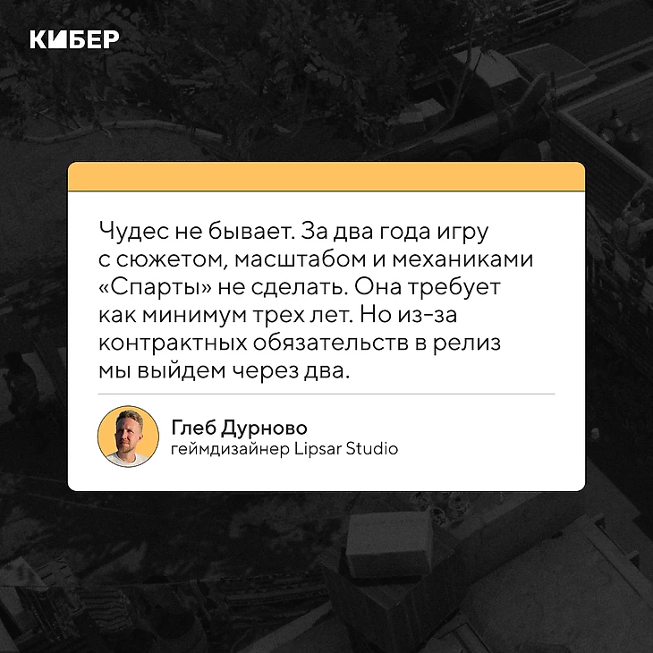 Чудес не бывает, за два года игру с сюжетом, масштабом и механиками «Спарты» не сделать. Она требует как минимум трех лет. Но из-за контрактных обязательств в релиз мы выйдем через два.