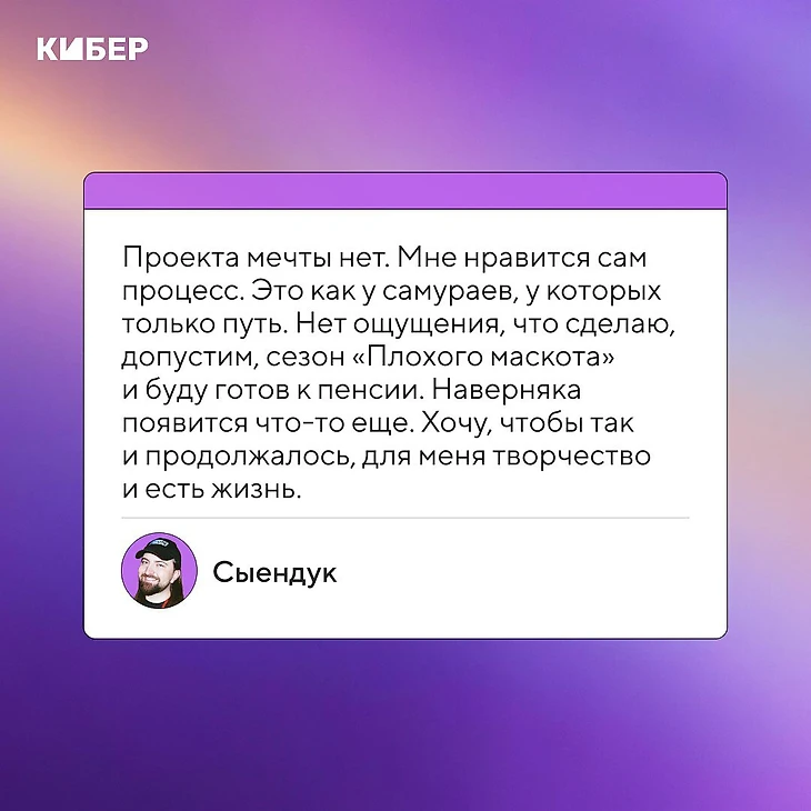 – Прямо проекта мечты нет. Мне нравится сам процесс. Это как у самураев, у которых только путь. Нет ощущения, что сделаю, допустим, сезон «Плохого маскота» и буду готов к пенсии. Наверняка появится что-то еще. Хочу, чтобы так и продолжалось, для меня творчество и есть жизнь.