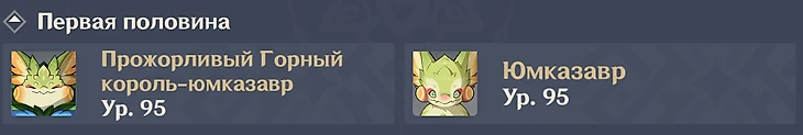 Бой начинается с трех Юмказавров, за ними следует босс, у которого 70% Дендро сопротивления. У короля-юмказавра 3 основные атаки. Он может: