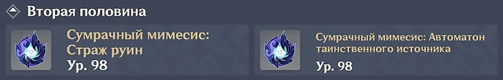 В первой половине второго зала вам встретится Сумрачный мимесис. Это мимик: моб, который имитирует других знакомых вам врагов. У него есть шкала щита под полоской здоровья – пока вы его не сломаете, не сможете атаковать. Барьер пробивают герои с механикой Благословения ночного духа либо множеством элементальных атак. Первые работают эффективнее.