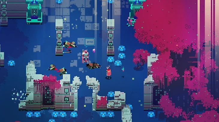 Hyper Light Drifter показывает, а не рассказывает: диалогов в игре нет. Вот вообще. Вся трагедия постапокалиптического мира удачно передается через яркий визуал и меланхоличный саундтрек.