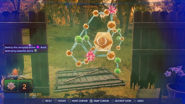 У дома вы встретите слепую женщину, которая расскажет вам о таинственном чудовище, посещающем ее двор. Не теряя времени, проберитесь во двор и используйте свой сканер. Вы обнаружите следы, ведущие к загадке. Избавьтесь от всех красных атомов, чтобы решить ее.