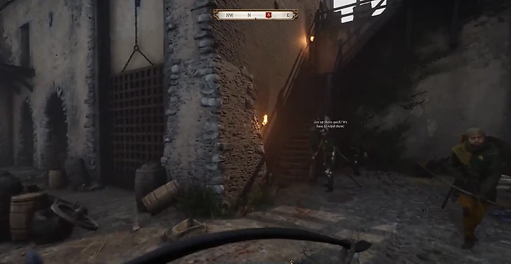 Далее проследуйте за командиром Сухим Чертом (Dry Devil) к юго-западному углу двора и поднимитесь по лестнице на стену замка.