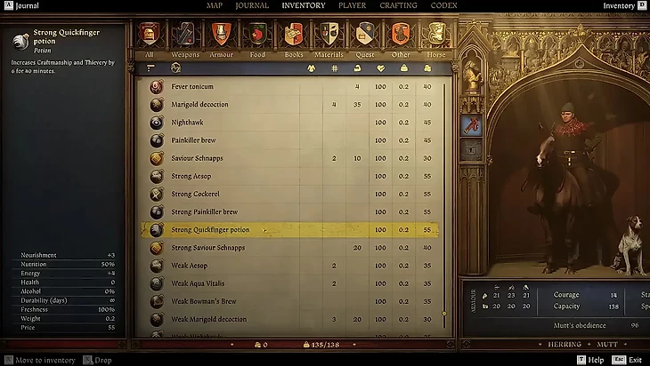 Следует приобрести зелье «Сильный быстрый палец» (Strong Quickfinger), которое позволит увеличить эффективность навыка «Воровство» сразу на шесть единиц. Купить зелье можно будет после выполнения 14 задания игры «Разговор с дьяволом» (Speak of the Devil). Зайдите в аптеку Куттенберга, товар стоит 45 грошей, но это начальная цена. На стоимость влияет репутация игрока, чем она ниже, тем зелье дороже.