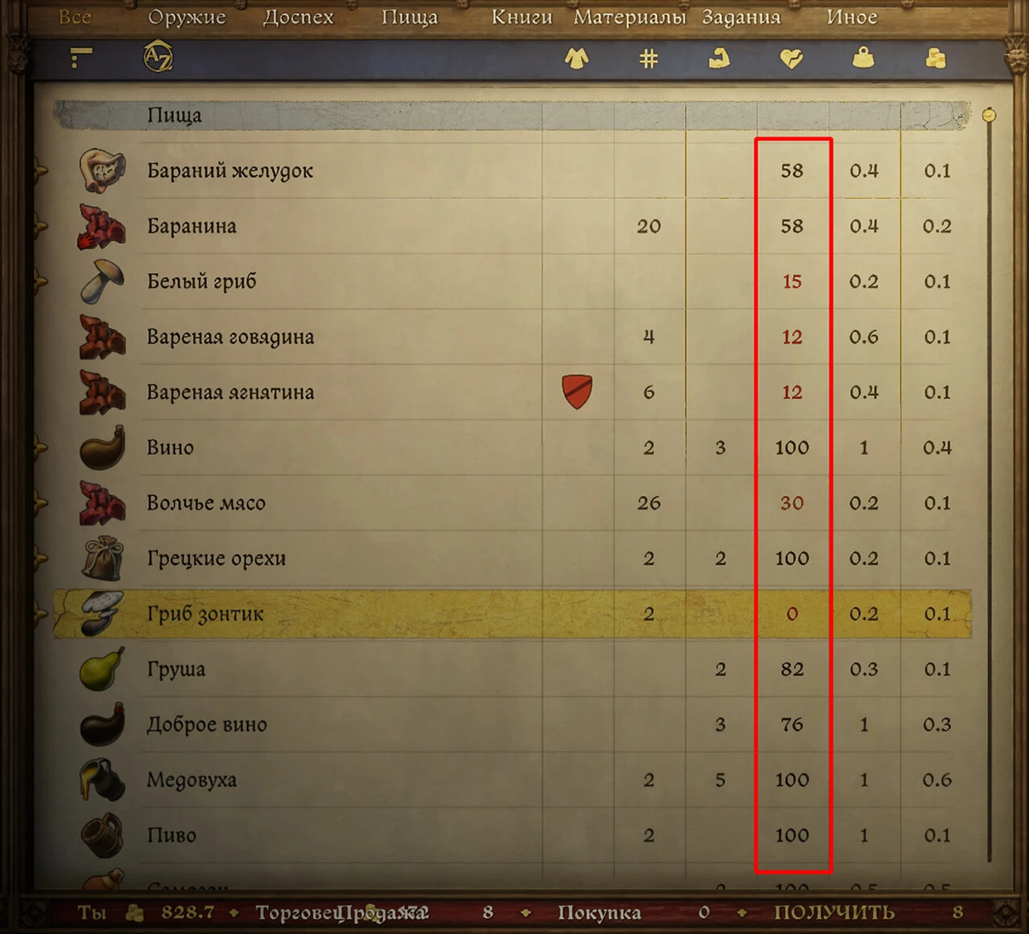 У всей еды в игре есть показатель свежести. Желательно не есть то, у чего уже меньше 50% свежести, иначе это приведет к отравлению. Совсем испорченная еда отмечена красным цветом – ее есть нельзя.