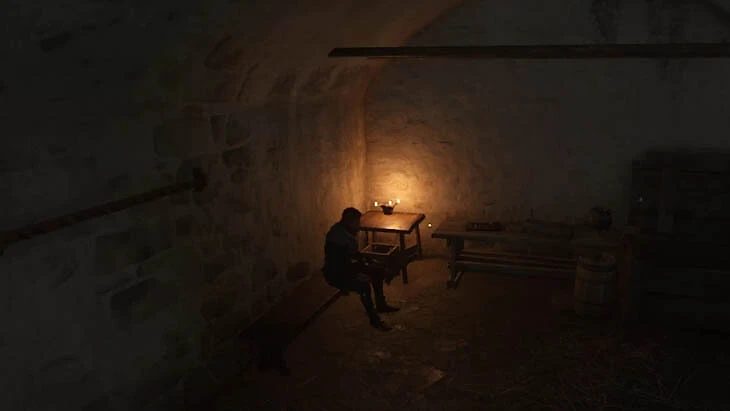 В дворике за столом расположилась группа мужчин из Моравии, и хотя выбор диалога с ними не повлияет на исход, вам предстоит добыть для них особый напиток. Моравская наливка хранится в охраняемом погребе, вход в который находится в углу гостевой зоны.