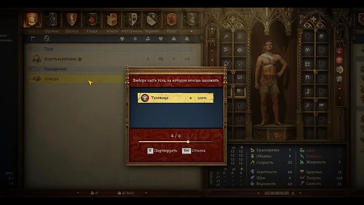 Чтобы справиться с этим, откройте инвентарь, выберите повязку, дважды кликнув на нее, и переместите ползунок в правую сторону для использования максимального количества повязки. Не забудьте также надеть короткую рубаху – другие вещи вам нужно найти на улице.