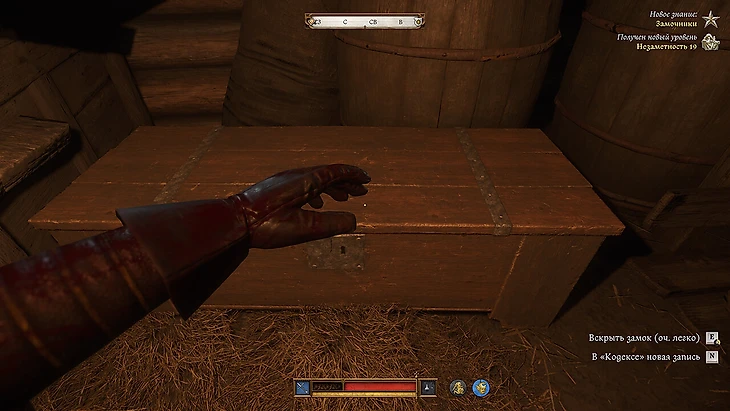 Квест Крейзеля называется Materia Prima. В нем нужно украсть документы из кабинета, но нас интересуют необязательные задания: найти воровскую одежду и потренироваться в незаметности. Для этого в сарае Крейзеля находится сундук с бесконечно закрытым замком очень легкого уровня. Он не расходует отмычки при открытии, поэтому можете вдоволь натренироваться на нем, пока уровень не вырастет и не откроются перки.