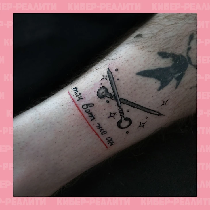 А потом мой друг Вася Скорбный, который начал заниматься татуировкой, предложил мне что-нибудь набить. Я понял, что у меня нет ни одной забавной татуировки, и выбор оказался очевиден. Приехал к нему домой, он разложил кушетку, подготовил эскиз гвоздей, его девушка набросала надпись, и мы начали. У меня было две просьбы: чтобы не получился партак (кое-как справился) и чтобы надпись была зачеркнута красной линией в олдскульном стиле (вообще не справился).