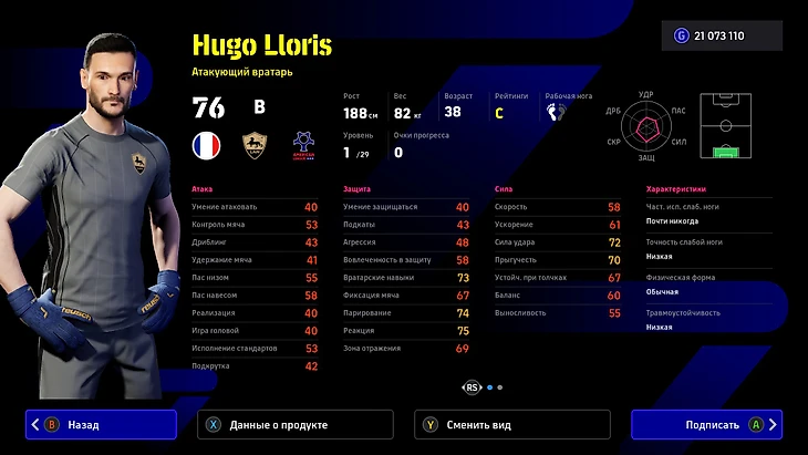 Бывший вратарь «Тоттенхэма» и сборной Франции сейчас играет в США. Уго Льорис порадует реакцией и парированиями на ленточке, а еще он прекрасно забирает пенальти. Навык «Способности капитана» снизит усталость полевых игроков.