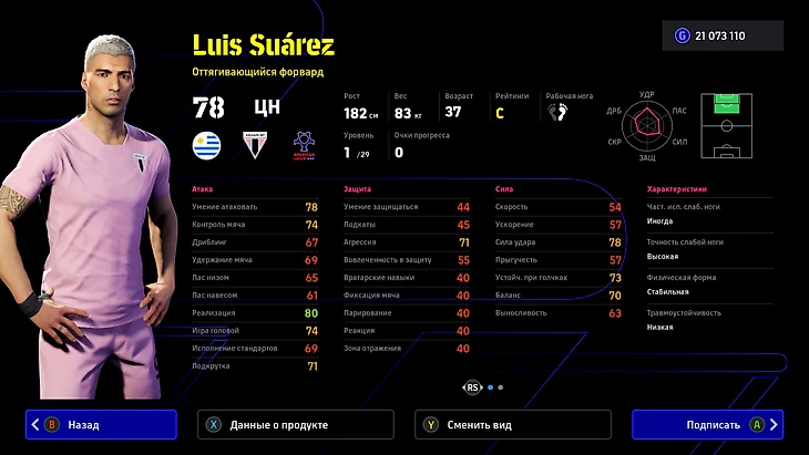 Луис Суарес – позиционный форвард. Из-за возраста он лишился рывка, зато получил превосходную точность ударов и целый набор навыков завершения – от «Удара без подработки» до «Дальних подкруток». Уругваец отлично подойдет для неторопливого раската соперника.