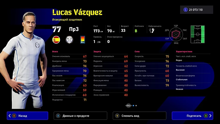 Испания славится фланговыми защитниками-долгожителями. Хесус Навас завершил карьеру зимой, но со статами из eFootball вполне мог играть еще несколько лет. У испанца отличная скорость, пасы в касание и дальние навесы, а еще он знает две позиции слева. Главный минус – плохая устойчивость в единоборствах.