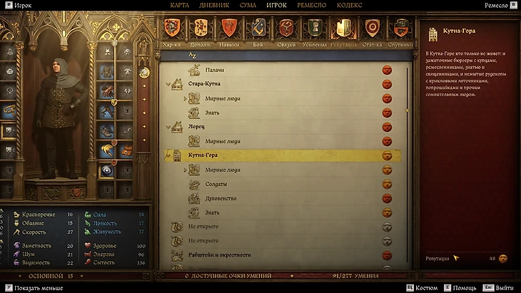 В игре репутация поделена между слоями населения и по их рабочей принадлежности – то есть в одном и том же селе вы можете пользоваться успехом у крестьян и быть преступником для солдат. Чтобы посмотреть все более детально, зайдите на вкладку «Игрок» и в верхнем меню, где навыки, найдите вкладку «Репутация». Разверните правую часть окна и понажимайте на названия поселений – так вы увидите, как к вам относятся, и сколько вам осталось до искупления грехов.