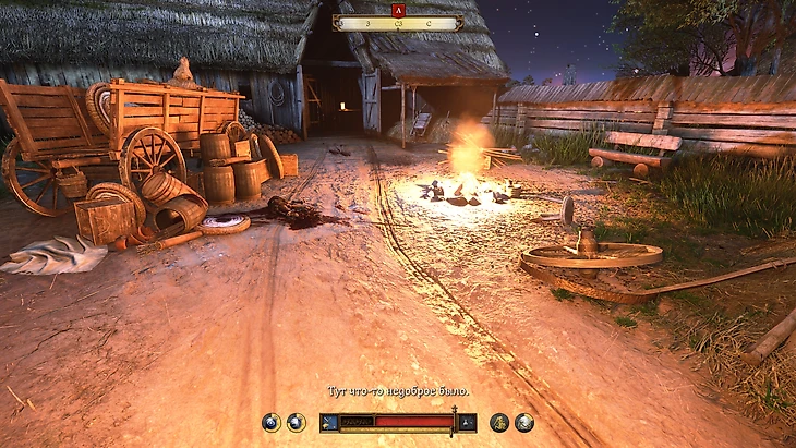 Упор в реализм жестко бьет по прохождению в первые десять часов. Постоянно нужно думать о еде, сне, прочности оружия и прочих мелочах вроде переедания. Велик соблазн съесть что-нибудь сверх нормы в 100 пунктов, чтобы дольше не отвлекаться на поиски еды, но за обжорство игра тут же накажет – в бою выносливость будет расходоваться больше и восстанавливаться дольше. То есть враг, даже если он один, «закликает» вас, пока вы тратите титанические усилия на один выпад. А если съесть просроченную еду, то придется следующий день проваляться в постели.