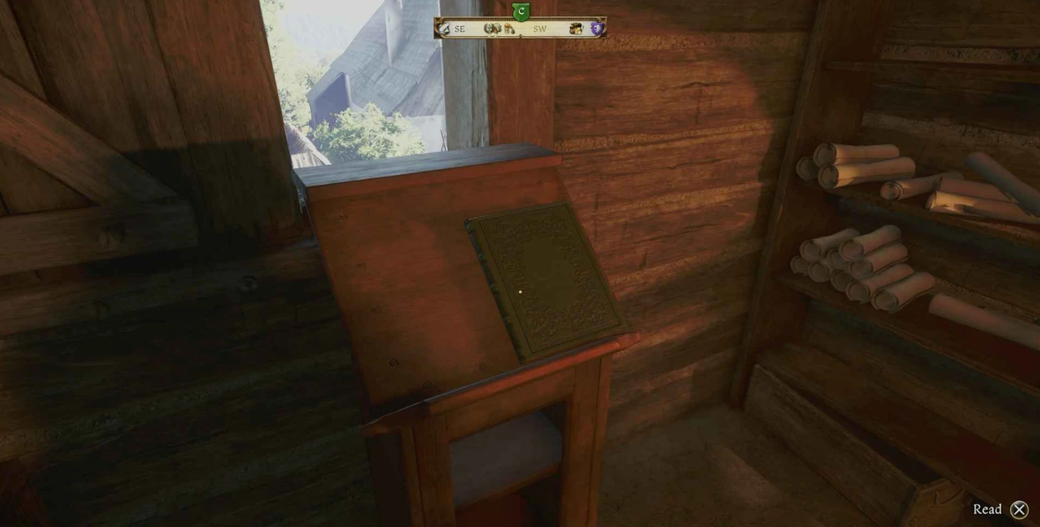 Найдите ратушу и зайдите в комнату слева. Взаимодействуйте с зеленой книгой на подставке и прочитайте все страницы.