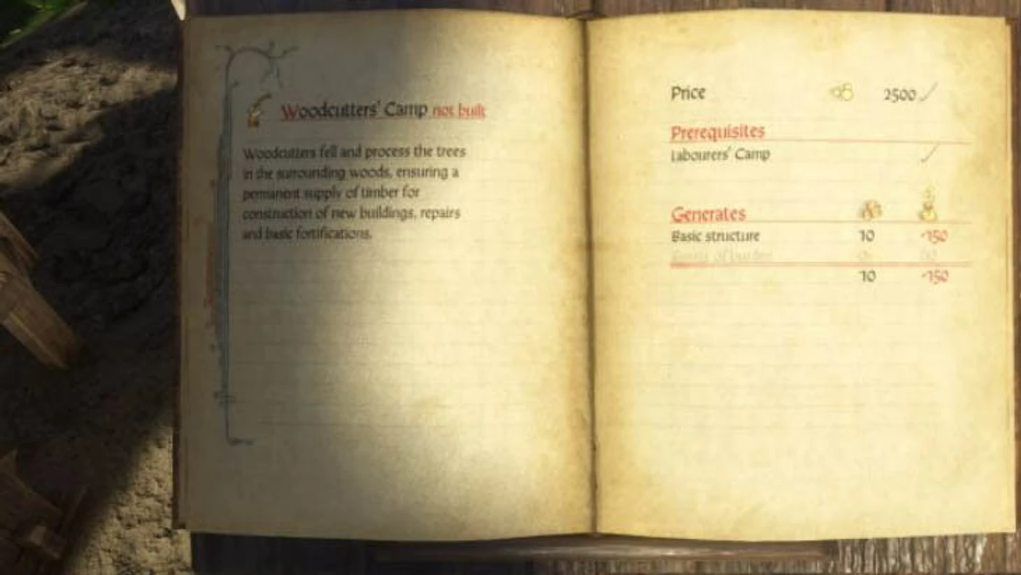 Восстановление поселения начинается с организации лесозаготовки. Лагерь лесорубов становится первым важным объектом, требующим вложения 2 500 грошей. Строительство займет несколько дней, в течение которых землемер мариуш будет контролировать все работы и указывать расположение будущих построек.