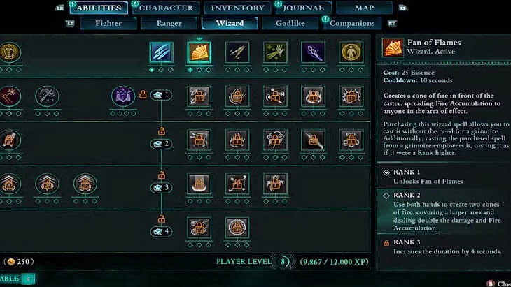 Огненное дыхание. Мощное наступательное заклинание выпускает поток огня из рук мага. При улучшении позволяет использовать обе руки для усиленной атаки. Эффективно сочетается с Гримуарами, ускоряя освоение более сильных версий заклинания.