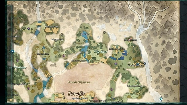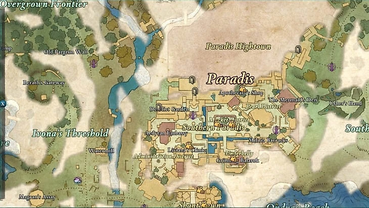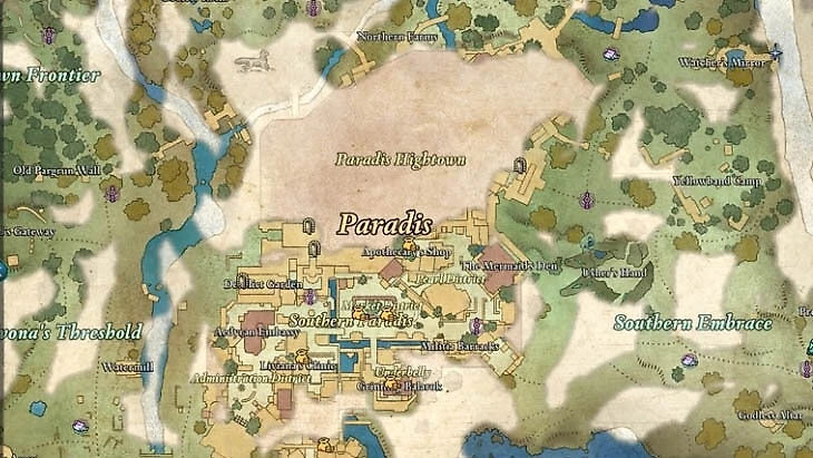 От Торгового Квартала Парадиса двигайтесь в северном направлении до аптекарской лавки, расположенной в восточной части района. Слева от магазина найдете уступ, на который нужно подняться. Продвигайтесь по правой тропе до деревянных платформ. Спустившись и преодолев строительные леса, вы окажетесь у балкона здания. Через него можно попасть внутрь строения.