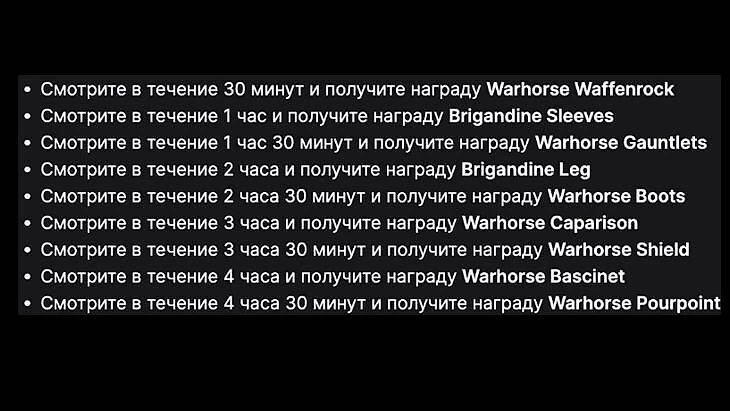 Система вознаграждений работает по принципу накопления времени просмотра. Уже через первые 30 минут зрителям был доступен особый предмет – Warhorse Waffenrock. Дальнейший просмотр открывал доступ к более редким наградам, включая элементы защитного снаряжения, такие как Brigandine Sleeves и Warhorse Gauntlets.