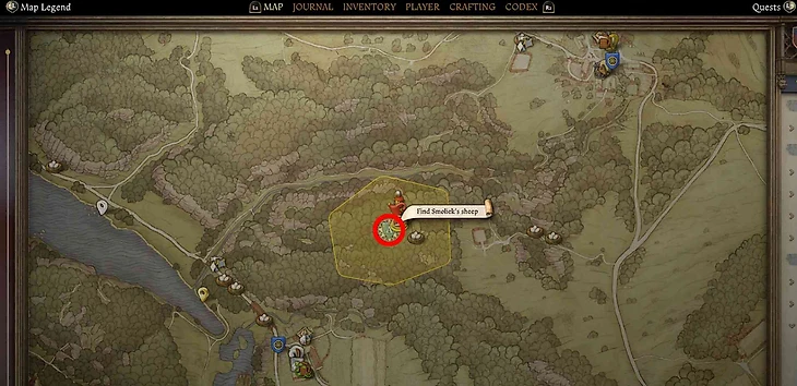 Отыскать потерявшуюся овечку пастуха. Направляйтесь по узкой дорожке в лес, который находится в западном направлении от пастуха. Ваша задача — найти волчью стаю и убитую овечку. Мертвое животное будет находиться в центре зоны поиска на холме, где на карте обозначена литера «А».