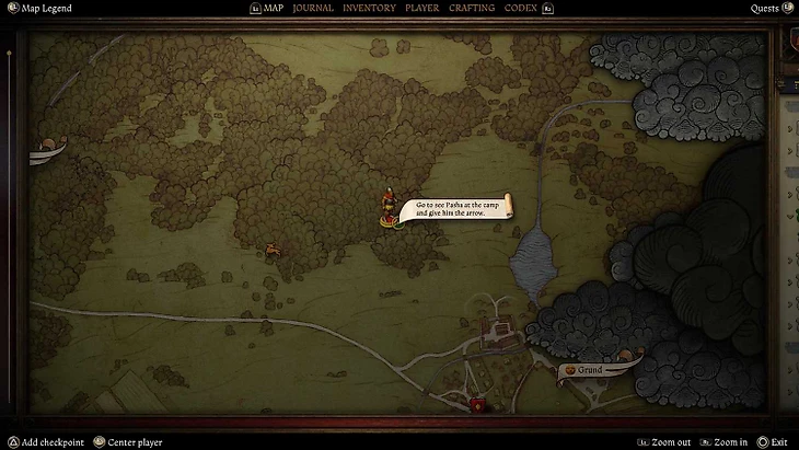 Отыскать лагерь Горюна не так-то просто. Известно, что он находится в густой чаще. Взяв за ориентир место, где Вы столкнулись с Зайцем, идите вдоль дороги на восток. Лагерь будет отмечен точкой на карте. Горюн потребует стрелу.