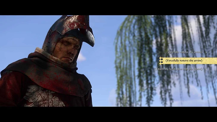 Рядом с ивой находится лопата, с помощью которой можно раскопать могилу и найти целое тело Карела. Дальше нужно будет вытащить стрелу из головы – либо осторожно, либо с силой, либо со всей дури размозжить голову лопатой. Как ни странно, но лучше выбрать именно лопату.
