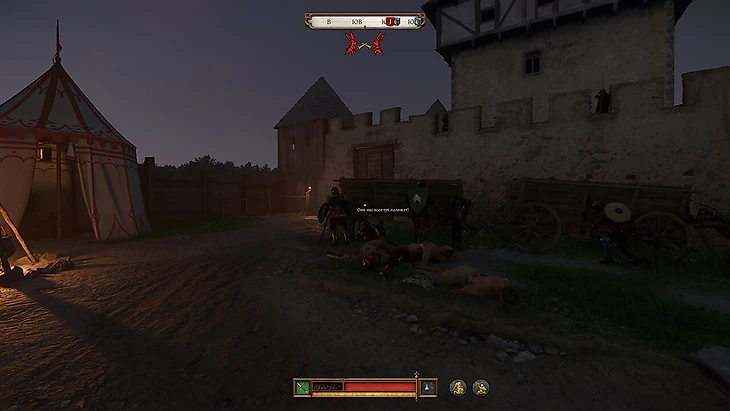 В первом случае ходите по деревне и убивайте крестьян, которые не успели сбежать. Во втором сперва одолейте Черта. Если не получится, то он сожжет деревню. В итоге Индро, Ян и Комар полезут на стену, чтобы пройти квест по стелсу. Вы увидите ворота, которые охраняют три солдата. Их можно отвлечь камнями и убивать по одному. Достаточно убить трех, чтобы подойти к воротам и поднять засов, с остальными разделаетесь уже позже.