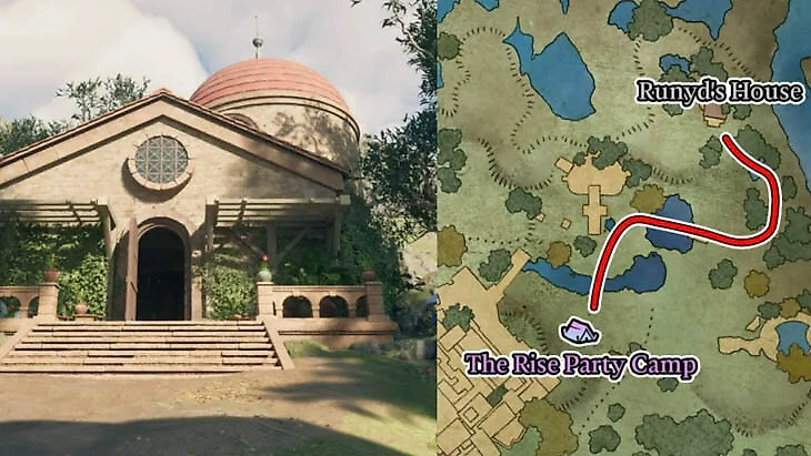 После создания ледяной переправы перепрыгните на остатки разрушенного моста. Следуйте по единственной доступной тропе до развилки. На развилке выберите правый путь – он приведет прямо к дому Руныда.