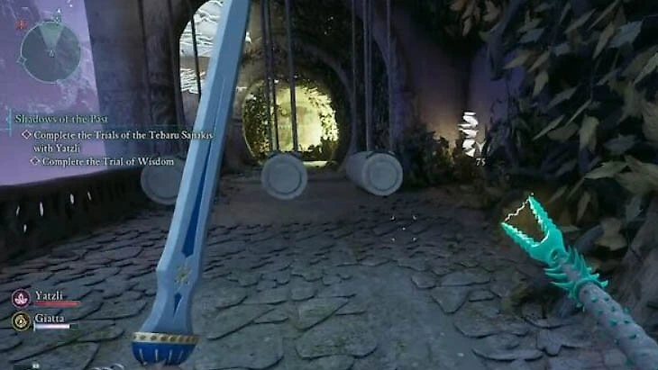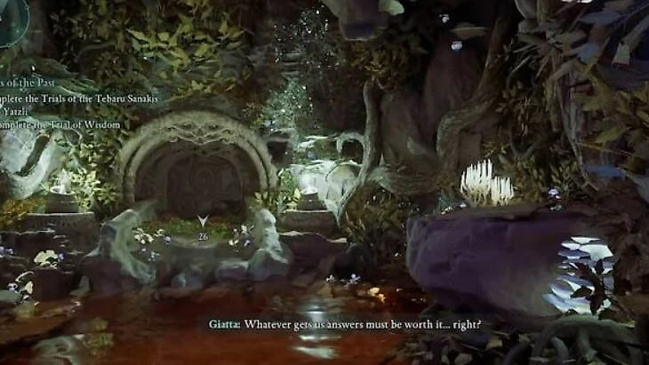 У левой двери, покрытой лианами, дождитесь их исчезновения. Поговорите с Танусой для начала следующего испытания. В комнате с красной мутной водой помните – жидкость причиняет урон. Обойдите водоем по правому выступу, чтобы достичь противоположной стороны.