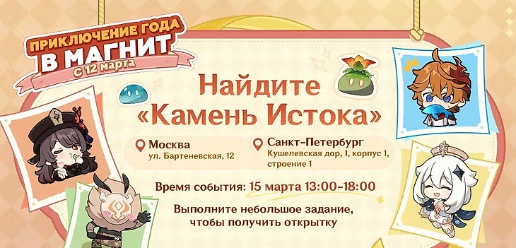 Коллаборация пройдет во всех городах России, где есть магазины сети Магнит. В Москве и Санкт-Петербурге 15 марта запланировано особое событие, связанное с «Камнем Истока». Участники смогут получить уникальные открытки, но будьте готовы к возможным изменениям в расписании из-за большого количества желающих. Убедитесь, что вы следите за новостями в приложении Магнит!