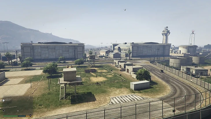 Проникнуть в ГТА 5 на тщательно охраняемый объект то еще удовольствие. Ее территориальное расположение заставляет задуматься, как хотя бы подойти к нему. К базе ведут два подъезда через реку по мостам, но они постоянно находятся под наблюдением. Охрана может по вам открыть огонь без предупреждения, как только начнете движение по одному из мостов.