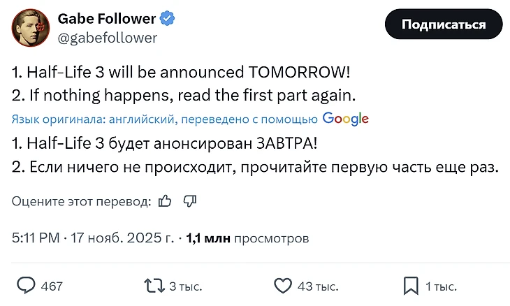Авторитетный инсайдер GabeFollower прогремел – анонс Half Life 3 состоится 18 ноября. Вероятно, публикация может быть просто шуткой, ведь 16 ноября он написал: «Ничего не ожидайте, и вы не будете разочарованы». В соцсетях уверены, что еще одна возможная дата анонса – 19 ноября, годовщина выхода оригинальной игры. В соцсетях Valve пока не намекала на скорый анонс игры.