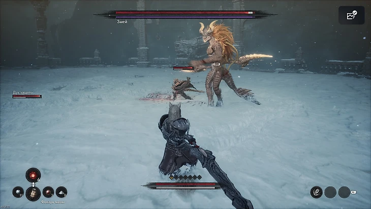 Хорошо, что сражения замечательные. Вот герой берет в руки огромный двуручный меч. Он тяжело замахивается и обрушивает лезвие с такой мощью, что земля дрожит, а в наушниках раздается приятный грохот. Враг же убедительно валится в сугроб, сокрушенно хватается за голову и заливает снег кровью. Кажется, такого импакта не было ни в одном другом соулсе – ни в Elden Ring, ни в Black Myth: Wukong.