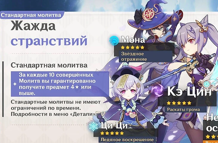 В баннере также доступны все эпические персонажи, кроме находящихся в текущих временных баннерах, и определенный набор эпического оружия. Для совершения молитв в обоих баннерах требуется предмет «Судьбоносные встречи». Примечание: состав постоянных баннеров может быть изменен разработчиками в будущем.