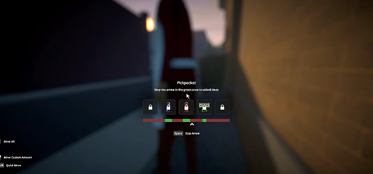 Перед вами будет красная полоска с небольшими зелеными фрагментами и указатель, который быстро двигается вдоль полоски. Выберите объект для кражи и нажмите пробел, когда указатель попадает на зеленую полоску. Звучит просто, но в этой механике нет права на ошибку.