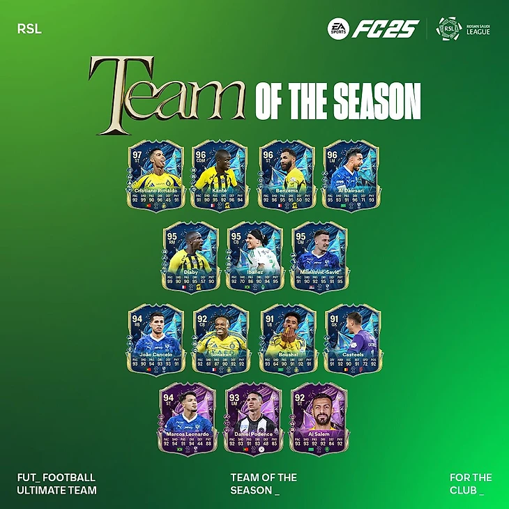● У Криштиану Роналду самый крупный рейтинг в саудовской лиге – 97. На один балл меньше получили Нголо Канте, Карим Бензема («Аль-Иттихад») и местная звезда Салем Аль-Досари («Аль-Хилаля»). Отдельно отметим мощную карту серба Сергея Милинковича-Савича (95).