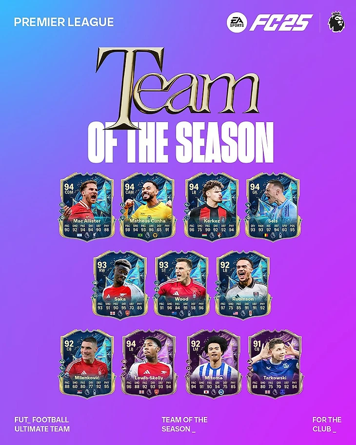 ● Главные игроки сезона АПЛ по мнению EA – Мохамед Салах и Вирджил ван Дейк из «Ливерпуля». Они получили рейтинг 97. В команде пять футболистов из клуба-чемпиона, игра также отметила выступления «Арсенала» (5) и «Ноттингем Форест» (3). Оба клуба из Манчестера получили всего по одному слоту – Эрлинг Холанд (96) и Бруну Фернандеш (94).