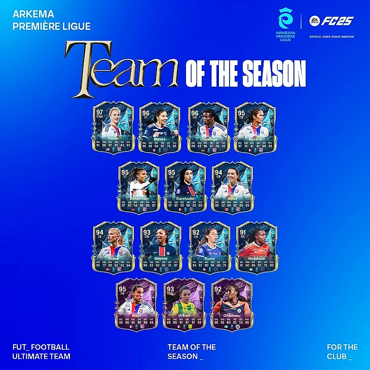 ● Самую сильную карточку в женской французской лиге получила американка Линдси Хоран из «Лиона» (97). Мощную карту выдали лучшему бомбардиру лиги – Кларе Матео из «Парижа» (96. Также в состав попали любимицы игроков из «ПСЖ» – Сакина Каршауи (96) и Грейс Гейоро (93).