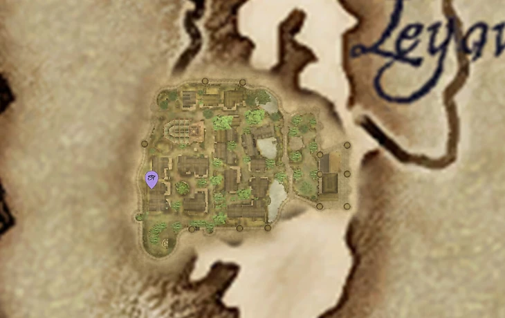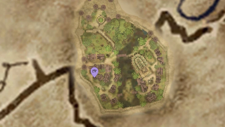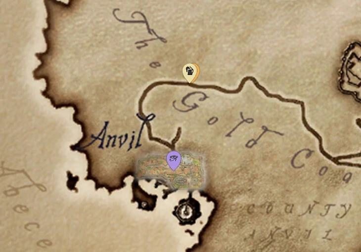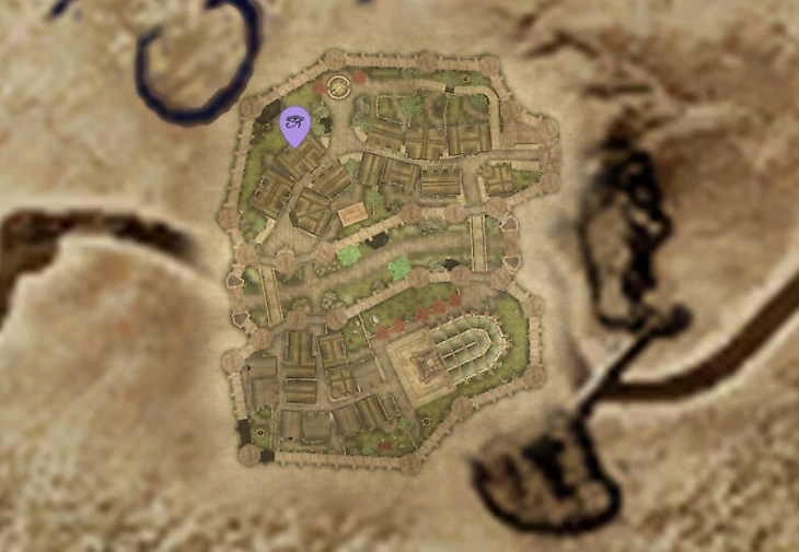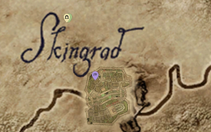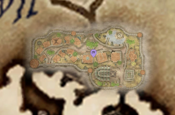 Если не получается и свитков под рукой нет, просто подкупите собеседника. Он расскажет, что украл посох и отдал его Сорису Арениму. Данмер живет в столице, в районе Талос Плаза, его дом отмечен на скриншоте ниже. Его расположение тоже надо повысить до 70, чтобы он согласился продать посох. Или можно украсть ключ из его письменного стола, пойти в подвал и взять посох оттуда.