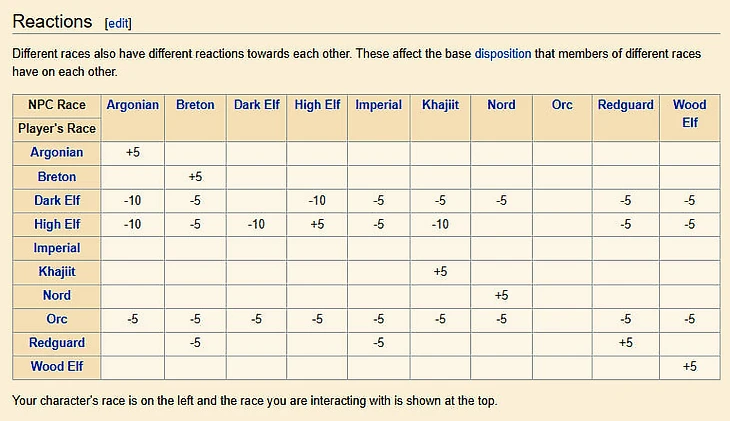 В таблице раса вашего персонажа расположена слева, а справа можно отследить взаимодействие с другими расами. Таким образом можно понять, что играбельных орков ненавидят все, кроме NPC-орков, и примерно такая же ситуация у темных эльфов. Но при этом сами темные эльфы-NPC не любят только альтмеров и орков. Р – репутация.
