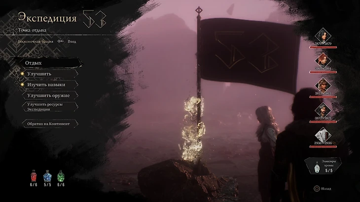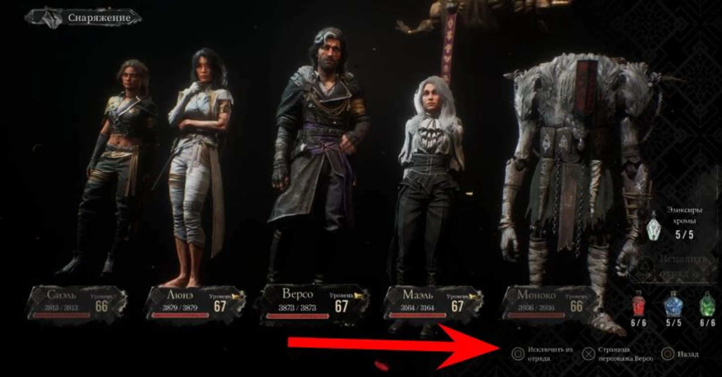 Важно: эликсир хрома и другие расходуемые предметы восполнятся, если отдохнуть у Флага экспедиции.